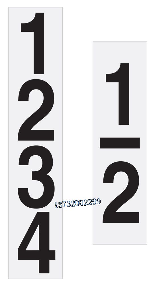 ⑶公里标的里程位数为三位、四位时,软塑料贴膜(或反光油漆)尺寸为高度750mm、宽度150mm。公里标里程位数为一位、二位时,软塑料贴膜(或反光油漆)尺寸为高度560mm、宽度150mm;半公里标的软塑料贴膜(或反光油漆)尺寸为高度560mm、宽度为150mm;公里标、半公里标的数字尺寸为高度170mm、宽110mm。